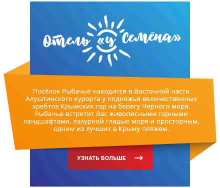 Приглашаем отдохнуть в минигостинице «У Семёна». Она находится в 30 км от Алушты,в селе Рыбачье. Горная дорога приведет вас в тихий уголок на Южном берегу полуострова Крым. Чистейший морской воздух и замечательный горный пейзаж окрестностей никого не оставит равнодушным. На огромном пляже, протяжённостью около 2км, есть и песок,и галька. Каждый найдёт себе место по своему вкусу.