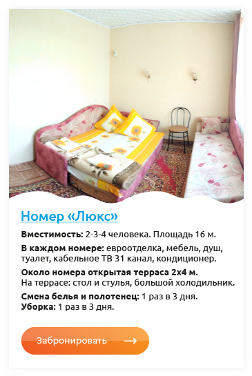 Желающие заняться дайвингом найдут себе уютное место и вдоволь поплавают. Не останутся в стороне и желающие порыбачить. На берегу много аттракционов для детей и взрослых. Мини гостиница «У Семёна» находится в 100 метрах от берега моря, в частном секторе. Большой двор, обилие зелени,цветов и различных экзотических растений создают атмосферу уюта и неповторимости. В мини гостинице есть номера различных категорий для 2-3-4 человек. Возможны варианты размещения 3+1, 4+1.